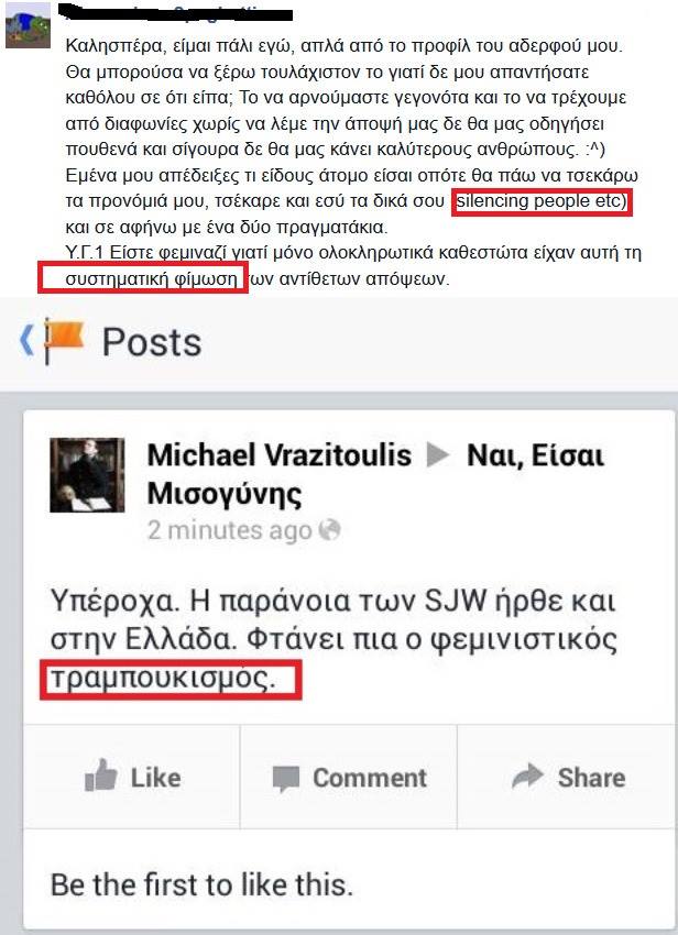 2 Γυναικείες απόψες σύμφωνα με τις οποίες η συμπεριφορά καποιων γυναικών ευθύνεται για τον μισογυνισμο των αντρών -λες και ειναι φυσικο να υποτασσονται ολες οι γυναίκες στα κοινωνικα πατριαρχικά στερεοτυπα αλλιως αξίζει σε ολες μας να τιμωρηθουμε. ΟΧΙ κορίτσια, δε μας φέρονται άσχημα γιατι κάποιες μας χαλάνε το όνομα, μας φέρονται άσχημα γιατί είμαστε γυναίκες σε μια μισογυνική κοινωνία.