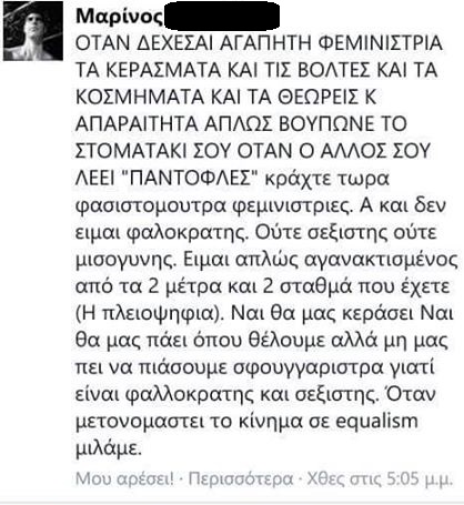 Εχω σιχαθει λοιπον τους άντρες που χρησιμοποιουν το κέρασμα ως δικαιολογία κατά του φεμινισμού. Κι εμείς κερνάμε και παίρνουμε δώρα και κάνουμε βόλτα τους φίλους και τις φίλες μας, δεν ακούς καμία μας να γκρινιάζει γιατι δεν γίνονται σκλάβοι μας, για εμάς είναι μέρος των ΑΝΘΡΩΠΙΝΩΝ ΣΧΕΣΕΩΝ όχι ιδιοτελών υπολογισμών. Αν εσύ λοιπό το κάνεις για να μπορείς να ζητάς μετά να σου φερουν τις παντόφλες ή να σου κάτσουν, μην κλαίγεσαι όταν σε κοιτάνε και γελάνε στη μούρη σου λέγοντα ΟΧΙ. Γιατί είναι σαν να λές «Εγώ έκανα το χρέος μου απέναντι στην πατριαρχία, γιατί δεν το κάνεις κι εσύ»; Γιατί έτσι γουστάρουμε. Γιατί δεν παίρνουμε απο συναισθηματικούς εκβιασμους. Γιατί τα δώρα σας δεν δημιουργούν κάποιο χρέος που θα πρεπει να ξεπληρώσουμε με σεξ ή οικιακή εργασία. Γιατί η ζωή μας δεν άλλαξε σημαντικά με το βραχιόλι που μας πήρατε ή το φιλέτο που μας κεράσατε, οσο και αν κάθεστε και κρατάτε τεφτέρια με το πόσα ξοδέψατε για εμας και περιμενετε να τα πάρετε πίσω και με τόκο.