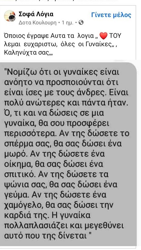 Οι γυναίκες είναι κι αυτές άνθρωποι, απλά λιγότερο εξελιγμένοι. Είναι άνθρωποι β’ κατηγορίας, που υπάρχουν ως συμπλήρωμα στη βασική κατηγορία, την οποία αποτελούν οι άντρες. Δείτε το σαν ένα extension στο chrome -δουλεύει και χωρίς αυτό, αλλά οκ, έχει κι αυτό τη χρησιμότητά του.