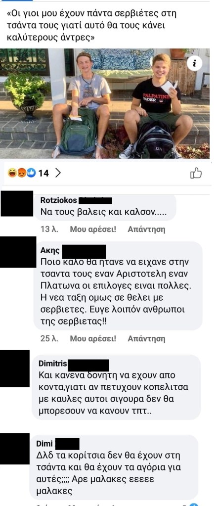 Πολλά έχουν ειπωθεί σε αυτή τη σελίδα για το πώς η πατριαρχία υποτιμά συνεχώς την γυναικεία φιλία έτσι ώστε να καλλιεργήσει τον ανταγωνισμό στις γυναικες και να τους δώσει την εντύπωση ότι είναι απομονωμένες η μία από την άλλη. Η γυναικεία φιλία συγκρίνεται συνεχώς με την αντρική έτσι ώστε η τελευταία να αναδειχθεί ως πιο «αυθεντική» και «πραγματική». Εδώ θα ήθελα όμως να θίξω μια άλλη πτυχή, το πώς ο τρόπος που κατασκευάζεται η αντρική φιλία συχνά τους εκπαιδεύει στο ελαφρύ bullying και την έλλειψη ενσυναίσθησης και ευαισθησίας τα οποία βαφτίζονται «ειλικρίνεια» ή «tough love». Ενώ η γυναικεία φιλία είναι πιο φροντιστική και γεμάτη τρυφερότητα και στοργή (ακόμα και αν η πατριαρχία προσπαθεί να τα πλαισιώσει ως «ψεύτικα»), η αντρική βασίζεται συχνά σε ανταλλαγή προσβολών και συνοδεύεται από ένα είδος λεκτικής (ή και σωματικής όπως υπονοεί το πρώτο σκίτσο) κακοποίησης.
