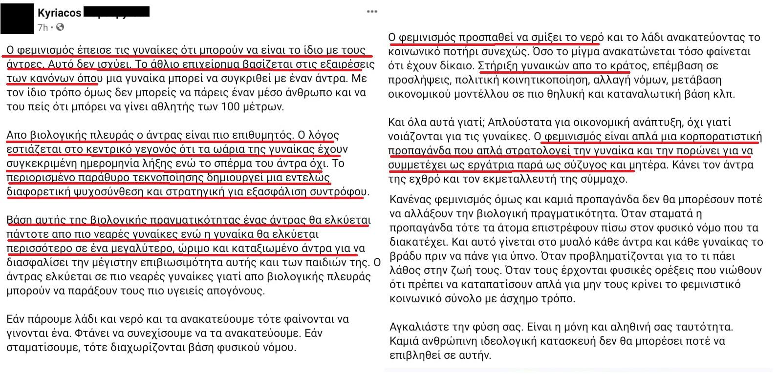 Κι αυτός ειναι ο λόγος που οι φεμινίστριες λέμε οτι η έμφυλη βία ωφελεί έμμεσα όλους τους άντρες, όχι μόνο αυτούς που την ασκούν, γιατί ακομα και οι μη βίαιαι μπορούν να παρουσιάζονται ως καλά παιδιά απλά στη βάση ότι δεν βασανίζουν και δεν δολοφονούν τις κοπέλες τους. Η πατριαρχική τρομοκρατία δημουργεί αυτού του είδους το entitlement στα Καλά Παιδιά™ και ρίχνει τόσο τα standards για τους άντρες που κάνει τις ίδιες τις γυναικες να πιστεύουν οτι αυτά αξιζουν ευκαιρίες γιατι δε θα τις βασάνιζαν ποτέ σε livestream. Οι Ελληνίδες κατα τ’άλλα την έχουν δει βασιλικότερες του βασιλέως γιατί δεν κάθονται να τους βασανίσει ο σύντροφός τους σε απευθείας σύνδεση και θα έπρεπε να νιώθουν ευγνωμοσύνη που οι Έλληνες δεν κάνουν τα ίδια -γιατί όπως ξέρουμε στην Ελλάδα δεν συμβαίνουν ποτέ γυναικοκτονίες και κακοποίηση γυναικών, αυτά ειναι αποκλειστικά ρωσικά φαινόμενα