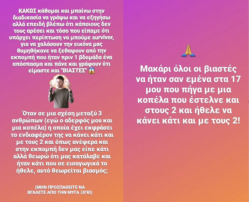 Βέβαια το meme δεν μας διευκρινίζει αν η γυναικα εστέλνε και στον δεύτερο, τον κρυμμένο στην ντουλάπα, άντρα, στην οποία περίπτωση προφανώς δεν αποτελεί βιασμό. Μακάρι Παναγίτσα μου όλοι οι βιαστές να ήταν σαν τα αδέρφια Βαρουξή, που θα παρακολουθούσαν με ποιους μιλάμε και με ποιους φλερτάρουμε ώστε να αφήσουν αυτούς να πάρουν τη θέση τους και να μας βιάσουν σε ανύποπτο χρόνο γιατί όλοι ξέρουμε ότι αυτό δεν μετράει πραγματικά για βιασμό -ίσα ίσα, που μας απαλλάσσουν και από τον χρόνο να ξαναφλερτάρουμε και να κάνουμε από την αρχή σχέδια με έναν καινούριο άντρα.