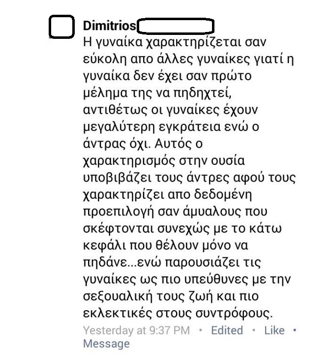 Καταρχάς, ας επαινέσουμε τον σχολιαστή για την ειλικρίνειά του, αφού παραδέχεται πως η γυναίκα θα χαρακτηριστεί πουτάνα για το ίδιο πράγμα που θα κάνει και ο ίδιος και σε οποιαδήποτε σεξουαλική δραστηριότητα κι αν αυτή εμπλακεί.