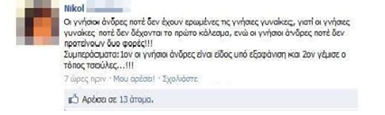 Εδώ βλέπουμε καταρχάς να αναπαράγεται η ιδεά πως το φύλο πρέπει να φέρει σφραγίδα γνησιότητας η οποία κερδίζεται με την συμμόρφωση στα πατριαρχικά πρότυπα -στην προκειμένη περίπτωση σε αυτά του άντρα του βαρύ και της γυναίκας της «δύσκολης». Ακόμα και βάσει της λογικής της ίδιας της ανάρτησης βέβαια, τα συμπεράσματα στα οποία καταλήγει είναι μάλλον αυθαίρετα καθώς η εγγενής αδυναμία ταιριάσματος του «γνήσιου» άντρα με την «γνήσια» γυναίκα δεν προκύπτει από κάπου πως οφείλεται στις γυναίκες -αλλά το έχουμε ξαναπεί, μην ψάχνετε για λογική στην πατριαρχία, μονο μίσος προς τις γυναίκες.