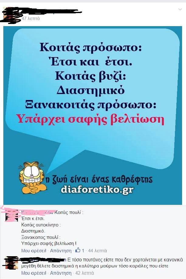 Εμένα πάντως μου γεννήθηκε μια απορία βλέποντας τα σχόλιο και δεκάδων γυναικών. Άντε, κάνετε fat shaming γιατί εσείς είστε και θεωρείτε θα παραμείνετε αδύνατες. Άντε κάνετε και slut shaming γιατί εσείς νομίζετε θα το γλιτώστε αν παραμείνετε σεμνές και αγνές.Και οκ, κοροιδεύετε όσες είναι single μετά τα 30 γιατι νομίζετε ότι εσείς σε αυτη την ηλικία θα είστε παντρεμένες και δε θα χωρίσετε και ποτέ. Αλλά ρε κορίτσια, τα σχολια για την ηλικία των γυναικών με τι λογική τα κάνετε? Οτι εσείς δε θα φτάσετε μέχρι τα 35 ώστε όλοι να μπορούν να σας μειώνουν και να σας κλείνουν το στόμα με μια απλή αναφορά στην ηλικία σας που αυτόματα θα σας κατατάσσει σε β κατηγορίας γυναίκες (που είναι ήδη β κατηγορίας άνθρωποι).