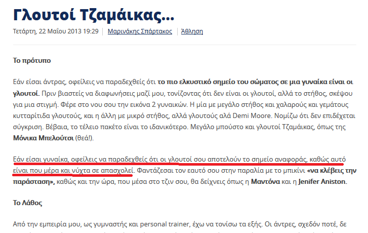 O εσωτερικευμένος μισογυνισμός γίνεται φανερός οταν για να εξηγήσεις το πώς «πρέπει» να δειχνείς ΕΣΥ καταφεύγεις στο τι (φαντάζεσαι ότι) θέλει ο άντρας. Λες και η αντρική ματιά πρέπει να καθορίζει το πόσο τρως, το αν γυμνάζεσαι, το πώς ζεις. Λες και υπάρχουμε για να μας βλέπουν οι άντρες και οχι ως αυθύπαρκτα οντα με δικές τους ανάγκες, δική μας εικόνα και άποψη για το σώμα μας.