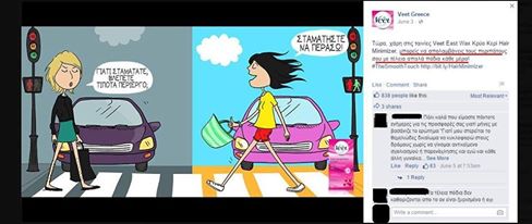 Εδώ έχουμε ένα παράδειγμα διαφήμισης που χρησιμοποιεί αλλά και επιβάλλει τα πατριαρχικά πρότυπα ομορφιάς για να πουλήσει ένα προϊόν. Η διαφήμιση δεν λέει «αν θες να αποτριχώσεις τα πόδια σου το τάδε προϊόν είναι το καλύτερο». Η διαφήμιση λέει πως αν δεν αποτριχώσεις τα πόδια σου θα είσαι ένα αξιοθέατο, θα σε κοιτάνε περίεργα, θα σε κοροϊδεύουν. Σου λέει πως τέλεια πόδια είναι μόνο τα απαλά και αποτριχωμένα και χωρίς τέλεια πόδια δε μπορείς να απολαύσεις την βόλτα σου. Πως στάση των άλλων απέναντί σου αλλά και η αυτοπεποίθησή σου εξαρτάται από το κατά πόσο τα πόδια σου είναι αποτριχωμένα.