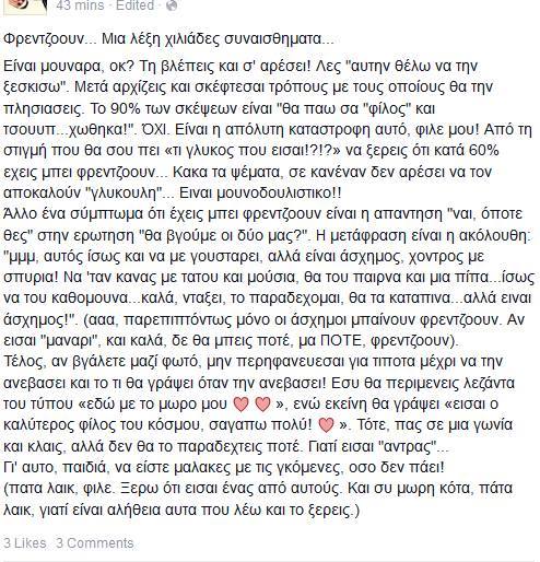 Ο συντάκτης αυτής της ανάρτησης και οι όμοιοί του βέβαια δε θα ένιωθαν καθόλου καλύτερα αν ήξεραν ότι με αυτή την σάπια προσωπικότητα καμία στην πραγματικότητα δεν τους βάζει στο «friendzone» αλλά μάλλον στο Ωχ -πάλι-αυτός-ο-creepy-τύπος-που-δε-με-αφήνει-σε-ησυχία-ας-του-απαντήσω-μονολεκτικά-στο-4ο-κατά-σειρά-αναπάντητο-μήνυμα-που-μου-έστειλε-για-να-μην-ξεκινήσει-το-shade-και-αρχίσει-να-με-κακολογεί-όπου-σταθεί-και-όπου-βρεθεί-zone.